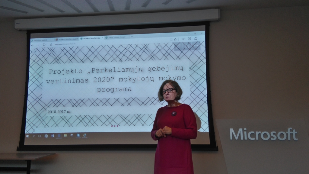 Lietuvių k. mokytoja Inga Balčytienė ir anglų k. mokytoja Živilė Kovėraitė dalyvavo vienos dienos mokymuose Vilniuje UAB „Microsoft Lietuva“. Mokymus vedė Ingrida Stankevičienė, Microsoft švietimo programų vadybininkė. Projekto vadovas Egidijus Čeponis pristatė projekto tikslus ir uždavinius, apžvelgė projekto veiklas. Virginija Navickienė, projekto metodininkė, kalbėjo apie projekto mokymosi modelį, formuojamąjį ir apibendrinamąjį vertinimą, elektroninio portfelio metodą ir projekto „EUfolio“ patirtį Lietuvos mokyklose. Šarūnas Končius, „Microsoft Lietuva“ technologijų ekspertas, supažindino su „Office 365“ aplinka ir „OneNote“ funkcionalumu, vartotojų paskyrų konfigūravimu, kompiuterio parengimu darbui. Edita Rabizaitė, projekto mokytoja konsultantė, „Microsoft“ mokytoja ekspertė, pristatė „Office 365“ kaip įrankį mokymosi pažangai fiksuoti, e. portfelio praktinius pavyzdžius „One Note“ aplinkoje, bendradarbiavimo galimybes, mokė kurti mokymosi kelią – planuoti mokinio mokymąsi, refleksiją ir įsivertinimą, klasės bloknotus. Seminaro pabaigoje dalyviai aktyviai diskutavo ir planavo ateities veiklas.