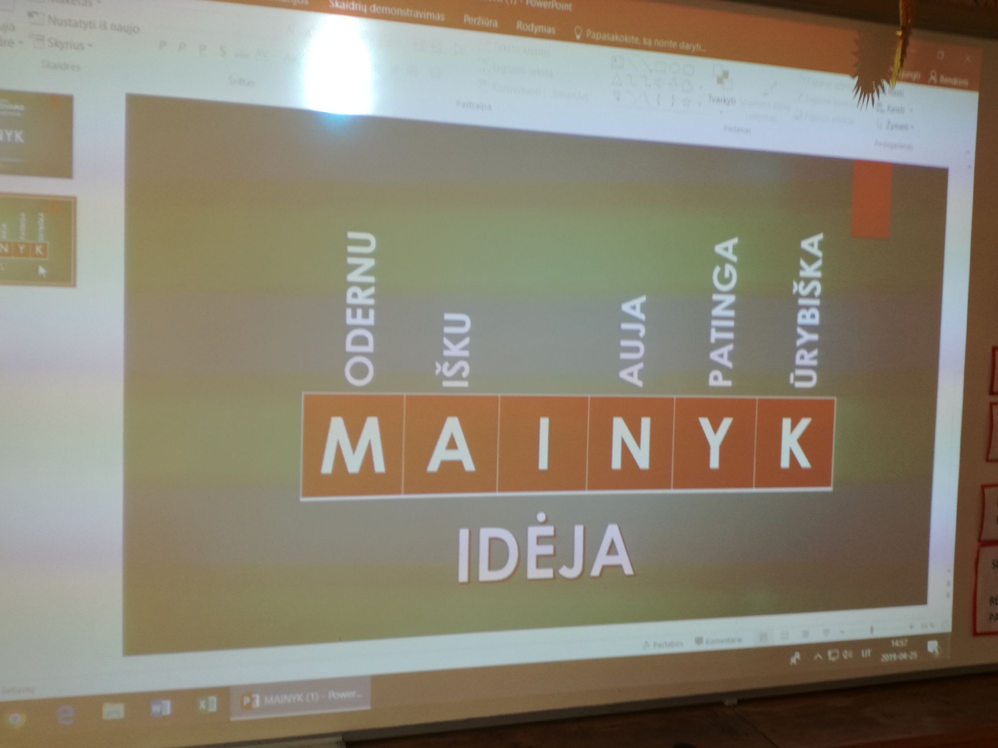 Mokytojos Aušra Bielskienė pristatė klasės valdymo strategiją, Ramunė Rimšienė pateikė idėją kaip pravesti individualius pokalbius su tėvais ir vaikais kartu, vertinti ir įsivertinti pasiekimus pusmečio pabaigoje. Mokytoja Valentina Gaubšienė pasidalijo idėja kaip skatinti mokinius bendrauti ir bendradarbiauti kuriant pasaulio pažinimui vaizdines priemones. Diskusijos vyko po kiekvienos idėjos pristatymo. Manau, pradinio ugdymo mokytojų apvaliojo stalo diskusija „Mainyk“pasiekė tikslą- idėjos pristatytos, diskusijos vyko. Sėkmės jas įgyvendinant.