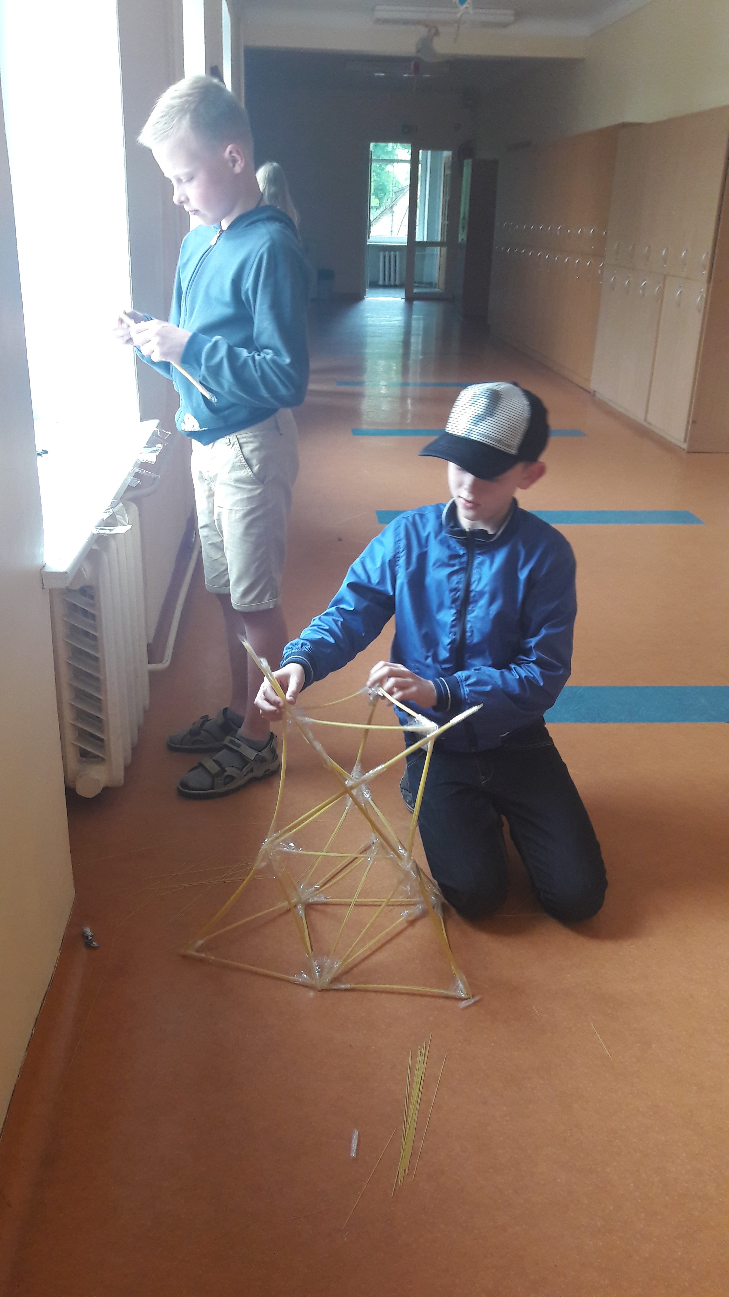 Statė statinius, aiškinosi, kuri plokštumos figūra suteikia statiniui stabilumo, ir leidžia jį sumontuoti kuo aukštesnį, kai statybinei medžiagai naudojami makaronai ir lipni juostelė.