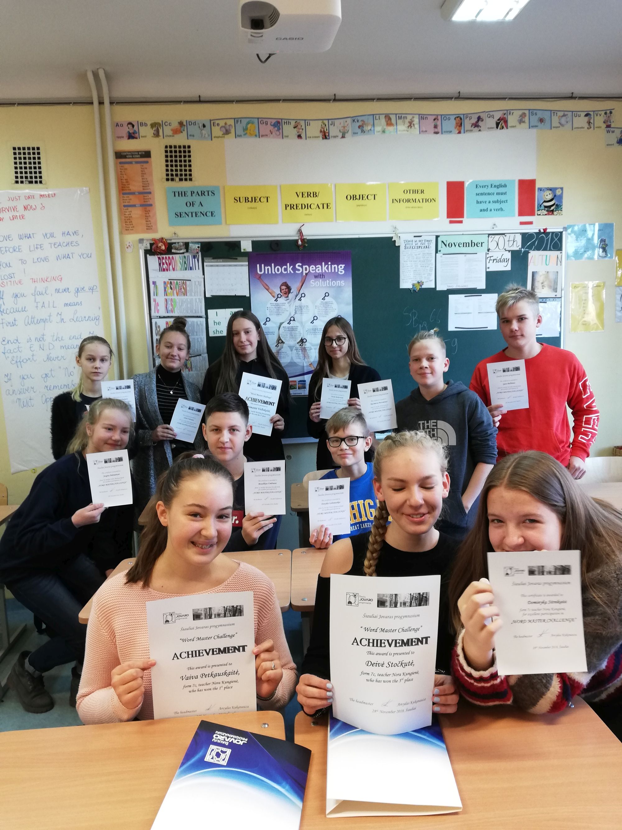 2018 – 11 – 28 Jovaro progimnazijoje vyko 7 klasių mokinių anglų kalbos konkursas „Word Master Challenge.“ Mokytojų K. Drazdovienės, V. Ramanauskaitės, N. Kungienės, Ž. Kovėraitės ir I. Malinauskienės 13 mokinių varžėsi, kuris geriau moka, žino bei suvokia anglų kalbos žodžius. Konkurso nugalėtojomis tapo:
