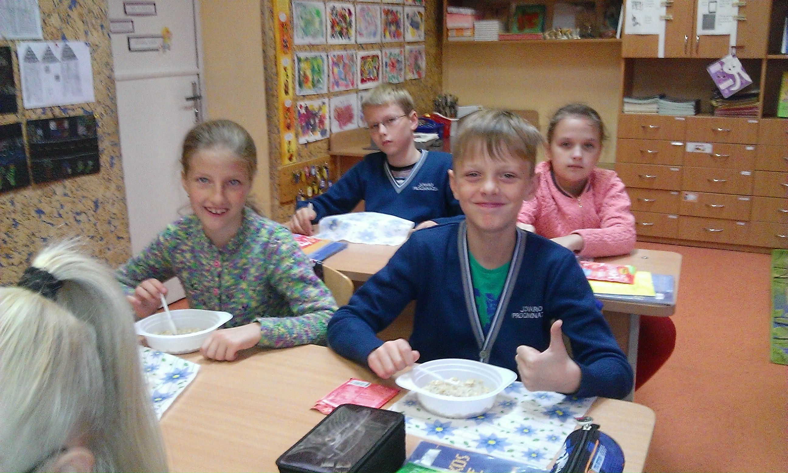 Spalio 10-oji – pasaulinė Košės diena. Mokykloje jau tapo tradicija tą dieną pradėti sveikais pusryčiais – avižine koše. Kiekvienas pradinukas gavo po dubenėlį karštos avižinės košės pagardintos braškėmis ir bananais. Pakvipo visa mokykla. Smagu pusryčiauti visiems kartu. Pradinukai košę kabino noriai. Mokytojos priminė kas sudaro sveiko maisto piramidę, kuo naudingos košės. Vaikai dalijosi patirtimi kokias košes mėgsta, kaip pusryčiauja namuose. Dovanų gavo knygelę apie Dribsės ir Dribsio nuotykius, kurią perskaitę ir tėveliams primins kaip sveikai maitintis. Tai dar viena pamokėlė, kad mūsų vaikai augtų sveiki ir energingi. Ačiū „Malsenai” už košę.