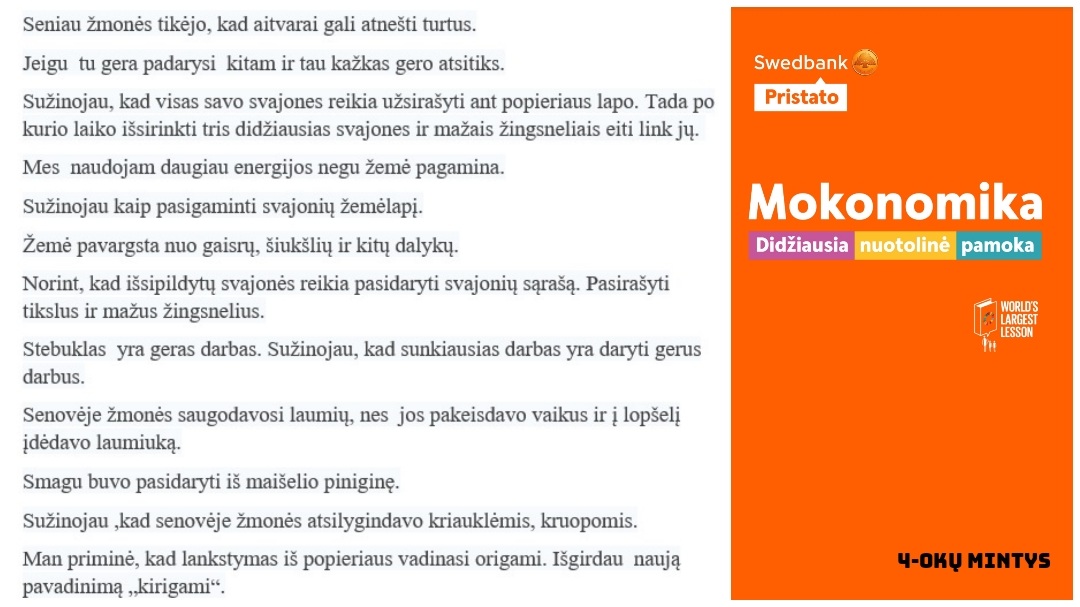 Sausio 21 d. 2b, 2c bei visi 4-8 klasių mokiniai dalyvavo „Swedbank“ inicijuotoje didžiausioje nuotolinėje pamokoje „MOKOnomika“, kurią vedė įvairių sričių ekspertai, tarp jų – menininkė Jolita Vaitkutė, keliautojas ir žurnalistas Orijus Gasanovas, iliuzionistas Rokas Bernatonis, aktyvus visuomenės veikėjas, savanoris Gabrielius Liaudanskas-Svaras, visuomeninių organizacijų atstovai ir edukatoriai, ekonomikos bei finansų specialistai. Mokiniai turėjo unikalią galimybę išgirsti daugybę įdomių ir naudingų pranešimų – apie pinigus, taupymą, tvarumą, meną, keliones, pilietiškumą, savanorystę, ateities profesijas ir kt. Mažesnieji ne tik klausėsi pranešimų, tačiau aktyviai įsitraukė į veiklas: šoko, piešė ateities pinigus, pasigamino popierines pinigines.Pasibaigus renginiui, mokiniai sakė, kad ne tik sužinojo daug naudingos informacijos, tačiau sulaukė ir padrąsinimo imtis tam tikros veiklos, nebijoti klysti, suprato, kad reikia tausoti aplinką, kurioje gyvena. Ačiū visiems už dalyvavimą ir aktyvumą!