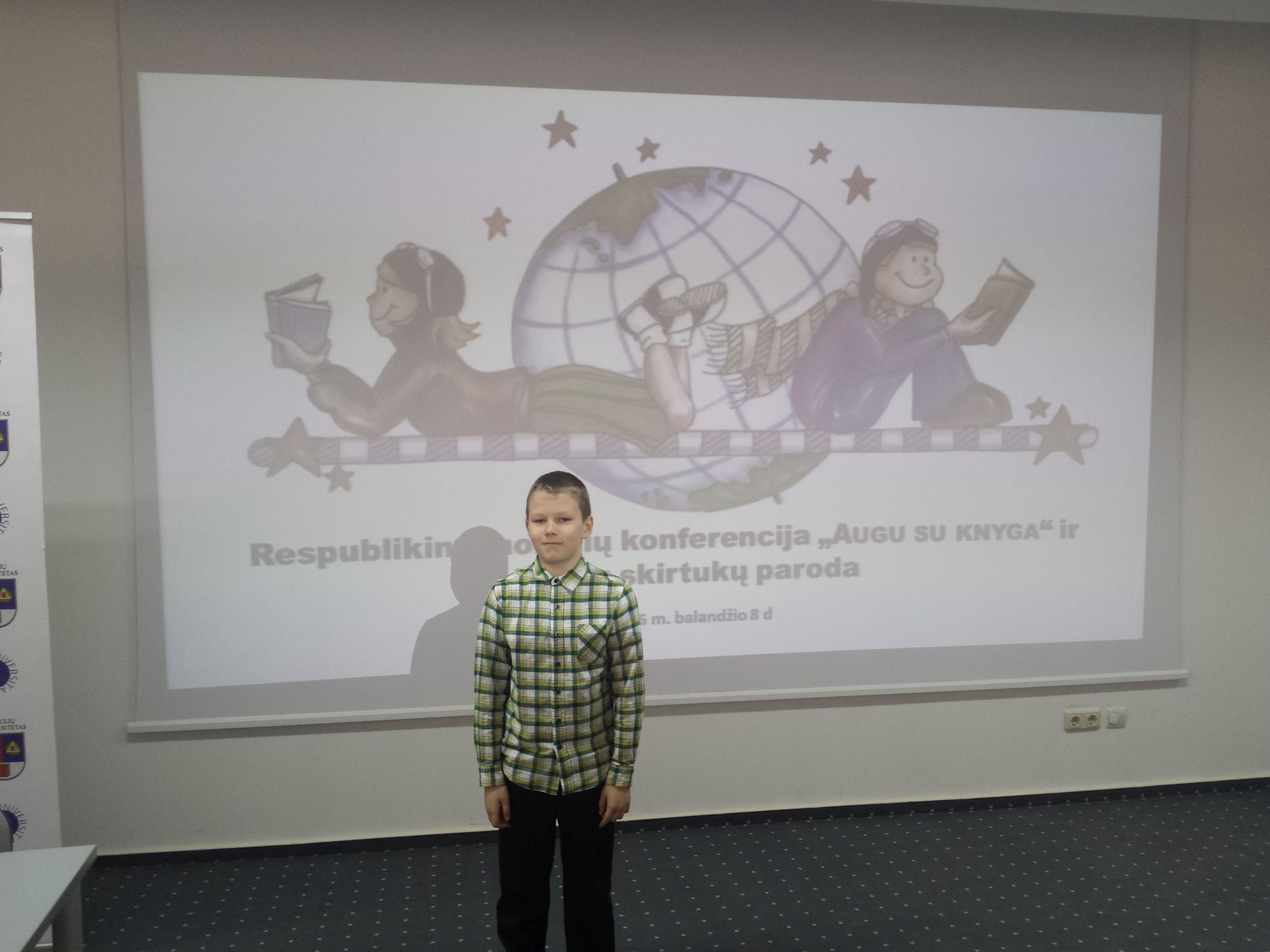 Balandžio 8 dieną daugelis moksleivių skubėjo į respublikinę mokinių konferenciją „Augu su knyga“, kuri vyko Šiaulių Universiteto bibliotekoje. Mokiniai pasakojo neįtikėtinas istorijas, kurias perskaitė knygose, deklamavo poeziją, pasakojo apie įvykdytus projektus. Džiaugiamės, kad mūsų mokyklai atstovavo 2a klasės mokinys Mantas Mendelis. Jis pristatė vieną iš savo mėgiamiausių knygų „Gustavo receptai” ir supažindino visus konferencijos dalyvius su Šatrijos kalno istorija, kuri yra aprašyta šioje knygoje.