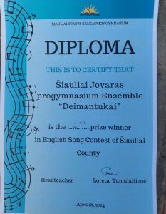 Balandžio 18d. Šiaulių Jovaro progimnazijos 7c klasės mokiniai dalyvavo Šiaulių miesto ir rajono mokinių dainų anglų kalba „Meilė kaip muzika skamba vis kitaip“ konkurse.