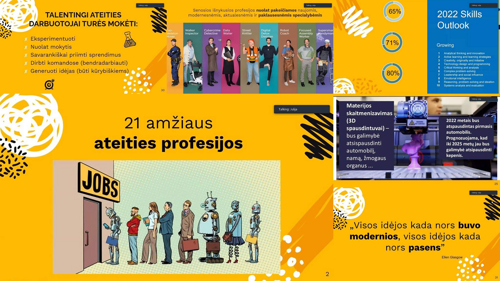 Septintų klasių mokiniai dalyvavo susitikimuose su Šiaulių jaunųjų technikų centro direktoriaus pavaduotoja ugdymui Julija Muningiene, kuri pristatė šio amžiaus profesijų prognozes ir perspektyvas, papasakojo, kokios kompetencijos ir įgūdžiai bus reikalingi būsimuose darbuose. Mokiniai sužinojo gausybę įdomių faktų apie robotizaciją, inžineriją, procesų skaitmenizavimą ir tai, kaip technologijos keičia mūsų gyvenimus, buitį ir darbo rinką. Ačiū už įdomias ir aktualias paskaitas!