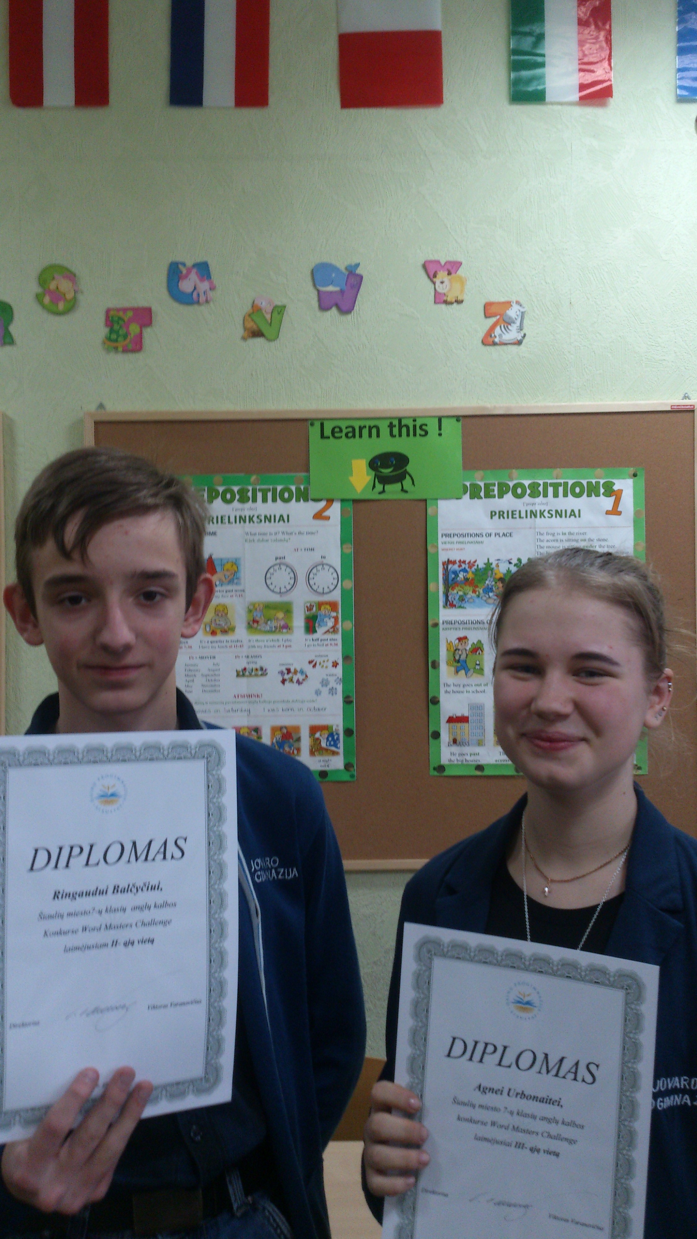 Džiaugiamės mūsų septintokų pasiekimais! 7a klasės mokinys Ringaudas Balčytis Šiaulių miesto anglų kalbos konkurse “WORD MASTERS CHALLENGE” užėmė II vietą, o 7c klasės mokinė Agnė Urbonaitė – III vietą. Džiaugiamės, kad net dvi prizines vietas užėmė mūsų progimnazijos mokiniai. Sėkmės jums jūsų darbuose.