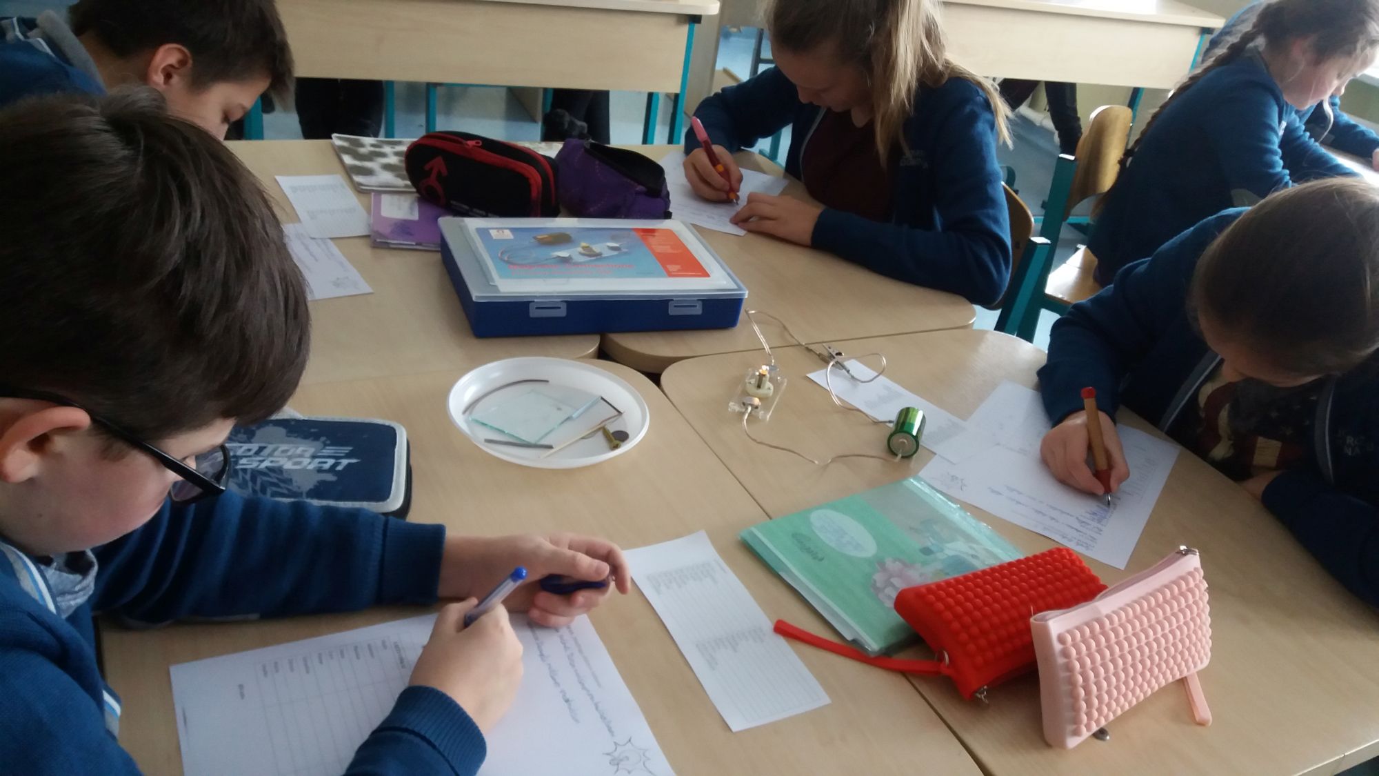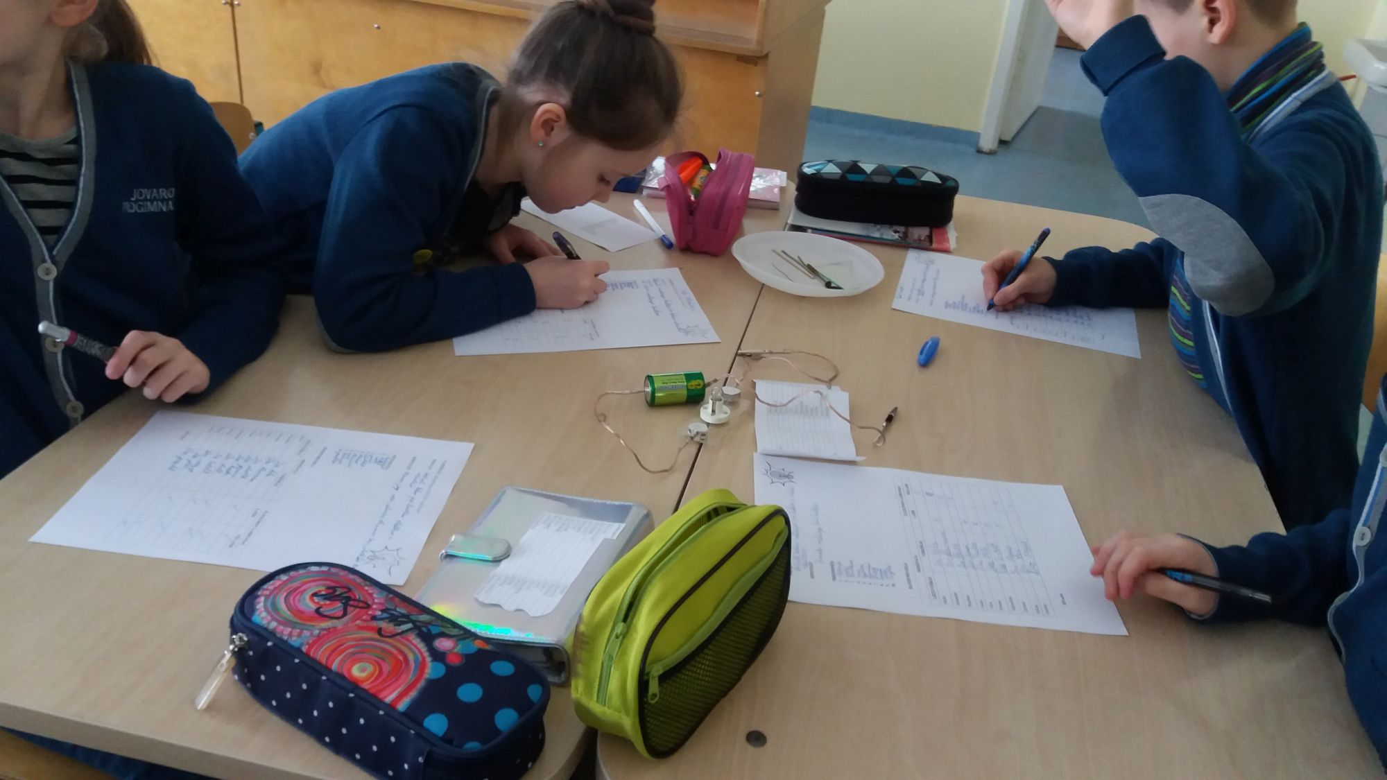 Vaikai tyrė skirtingas medžiagas (varį, medį, plastiką, tekstolitą, žalvarį, aliuminį ir kt.) sujungdami elektros grandinę, pildė lentelę, rašė žodžius vokiškai. Pabaigę darbą, parašė išvadas lietuviškai ir vokiškai. Tokios pamokos skatina vaikus tyrinėti, atrasti, susipažinti, dirbti grupėse, bendradarbiauti.