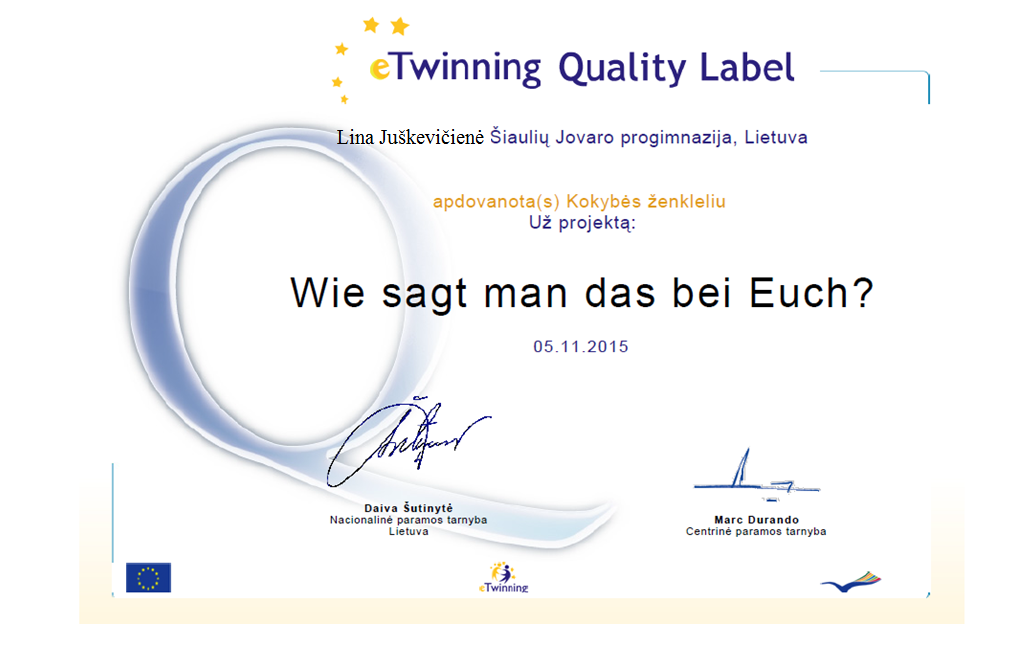 Kartu su vokiečių kalbos mokytoja Lina Juškevičiene užbaigėme eTwinning vokiečių koordinuojamą „Wie sagt man das bei Euch“ projektą. Mūsų partneriai buvo vokiečiai ir turkai.
