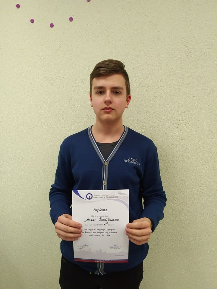 2018.02.14 Jelgavoje vykusioje anglų kalbos olimpiadoje 8c klasės mokinys Medas Radišauskas, įveikęs 19 mokinių iš Lietuvos ir Latvijos, užėmė pirmąją vietą. Džiaugiamės,didžiuojamės ir sveikiname Medą.
