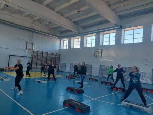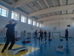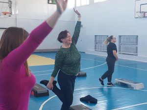 Fizinio ugdymo mokytoja R.Pociuvienė sukvietė kolegas į sporto salę, kurioje muzikos tempu judėjo visi… Tai viena iš įgyvendinamo sveikatinimo projekto ,,Sportuok ir būk sveikas” veiklų. Projektas finansuojamas Šiaulių miesto savivaldybės Visuomenės sveikatos rėmimo specialiosios programos lėšomis.Organizatoriai