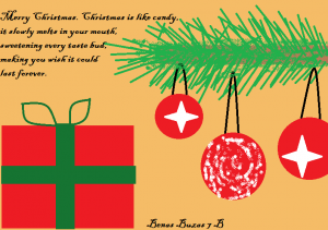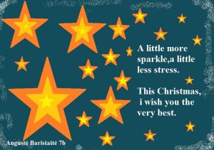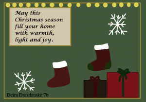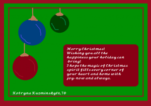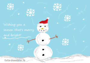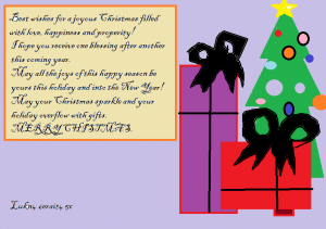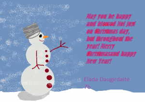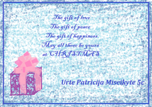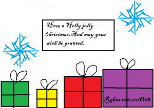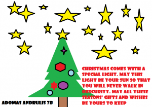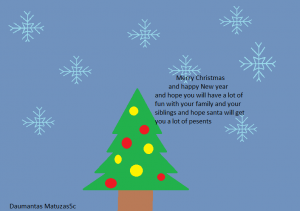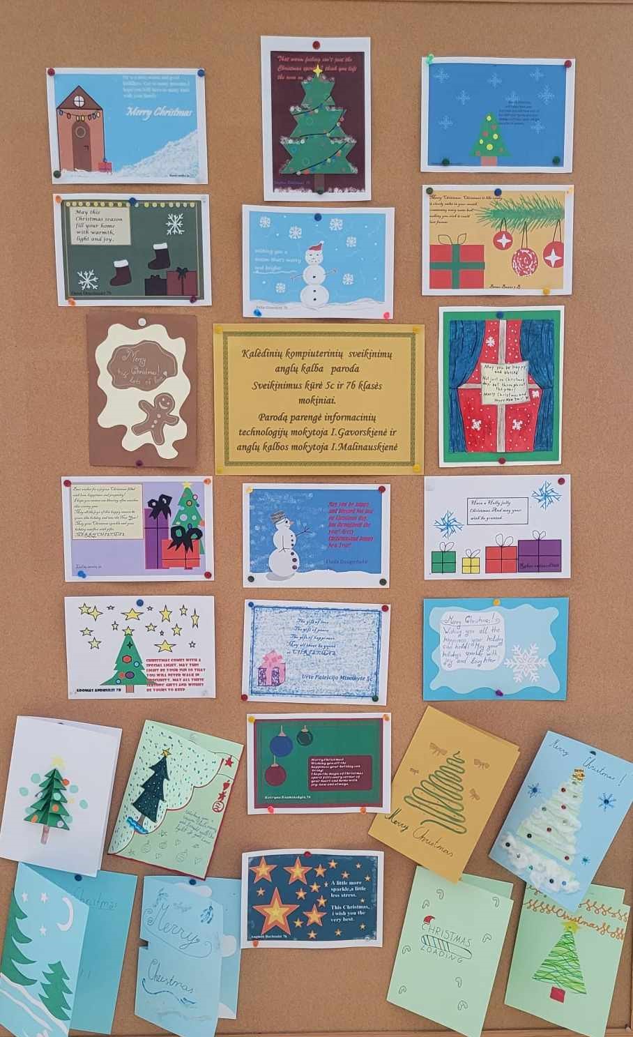 Progimnazijos informacinių technologijų kabinete (nr. 206) veikia mokinių kompiuterinių kalėdinių sveikinimų anglų kalba paroda.