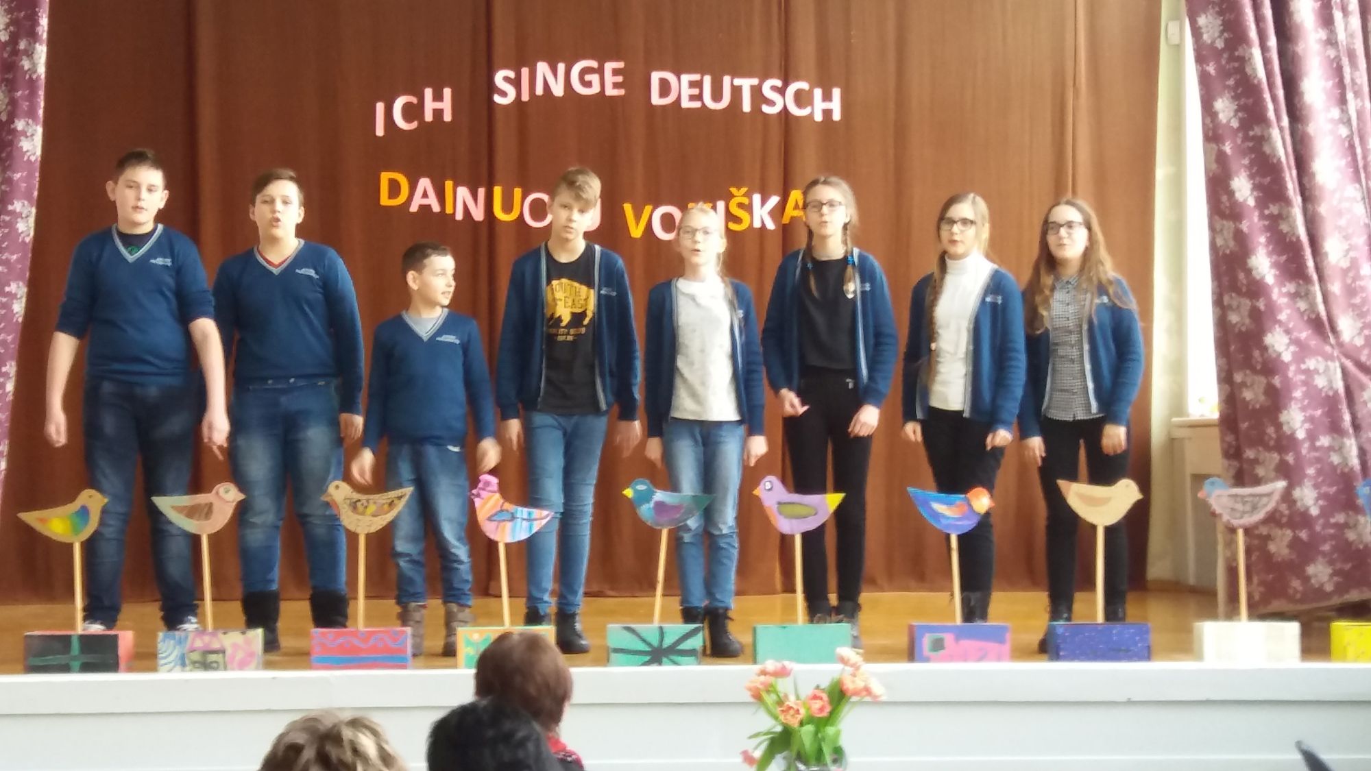 Kovo 9d. 6 b,c,d klasių vokiečių kalbą besimokantys mokiniai dalyvavo vokiečių kalbos popietėje „Dainuoju vokiškai“ Zoknių progimnazijoje. Mokiniai dainuojant stengėsi parodyti veiksmais ką dainuoja: šokinėjo, imitavo plaukimą, skraidymą, imitavo būdvardžius didelis, stiprus….Vaikai pasižiūrėjo kitų mokyklų pasirodymus ir patys padainavo, visus vienijo gera nuotaika ir smagus tarpusavio bendravimas.