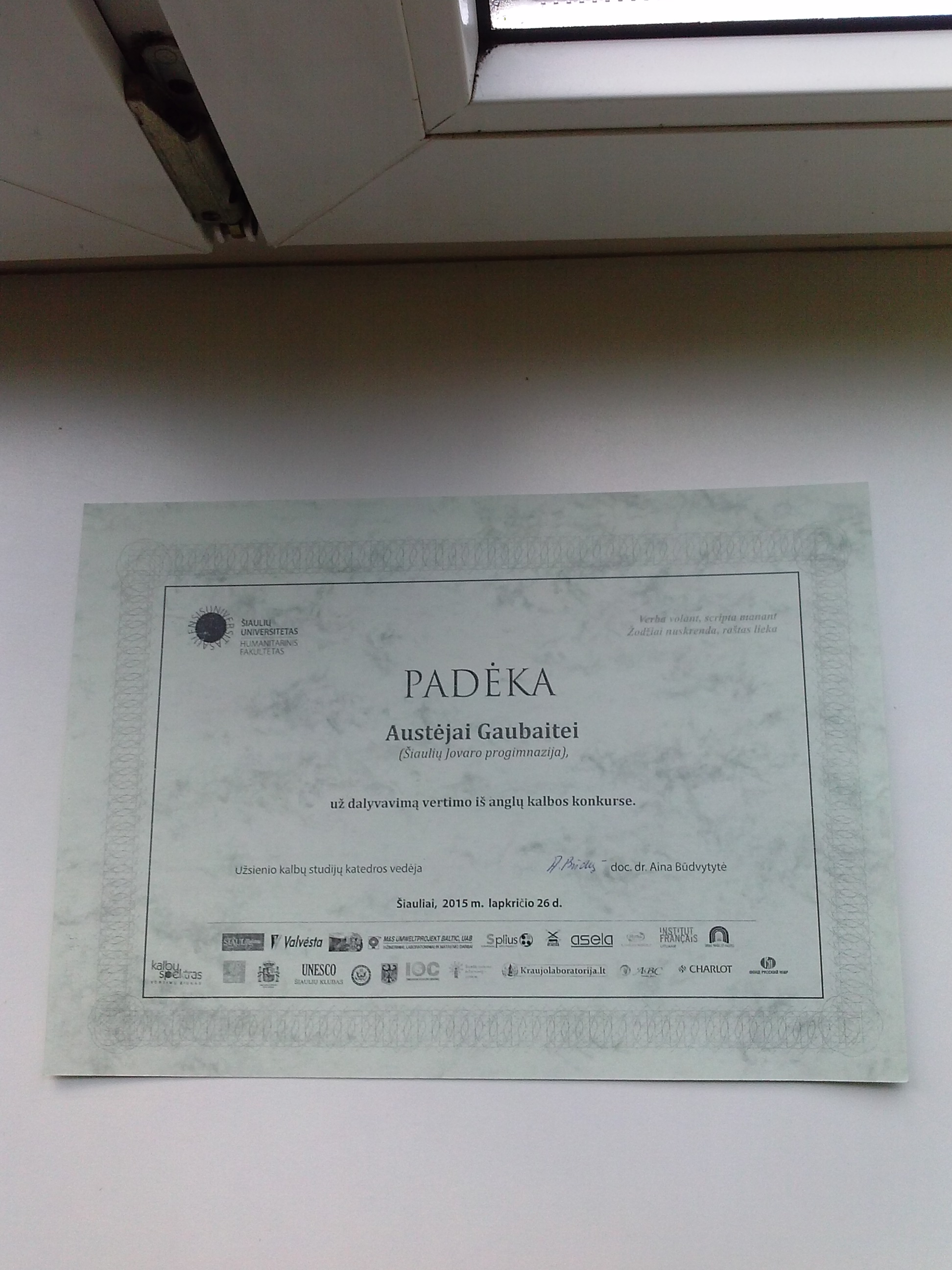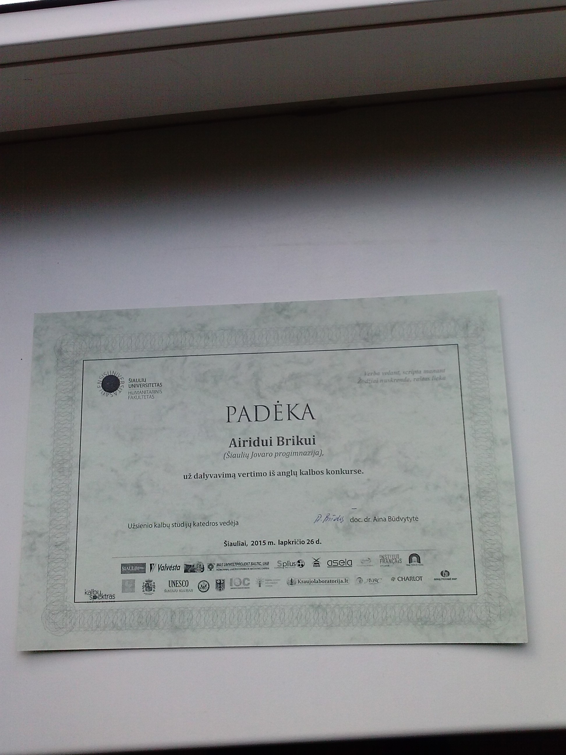 Lapkričio 26d. ketvirtadienį mūsų mokyklos mokiniai buvo pakviesti į Šiaulių Universiteto Humanitarinio fakulteto apdovanojimų šventę. Renginys buvo gražus, daug apdovanojimų ir puikių minčių kiekvienai kalbai, programinių numerių. Būsimi vertėjai – mokiniai ir studentai klausėsi lietuviškos poezijos, rusiškai ir angliškai dainuojamų dainų, vaišinosi tortu. Dėstytojos apdovanojo didelius ir mažus, tiek studentus, tiek moksleivius, pristatė renginio rėmėjus. Buvo išrinktos vertimo subtilybės – ne itin tiksliai išversti sakiniai, kartais netgi juokingi, kurie pakeitė ir visą teksto mintį.