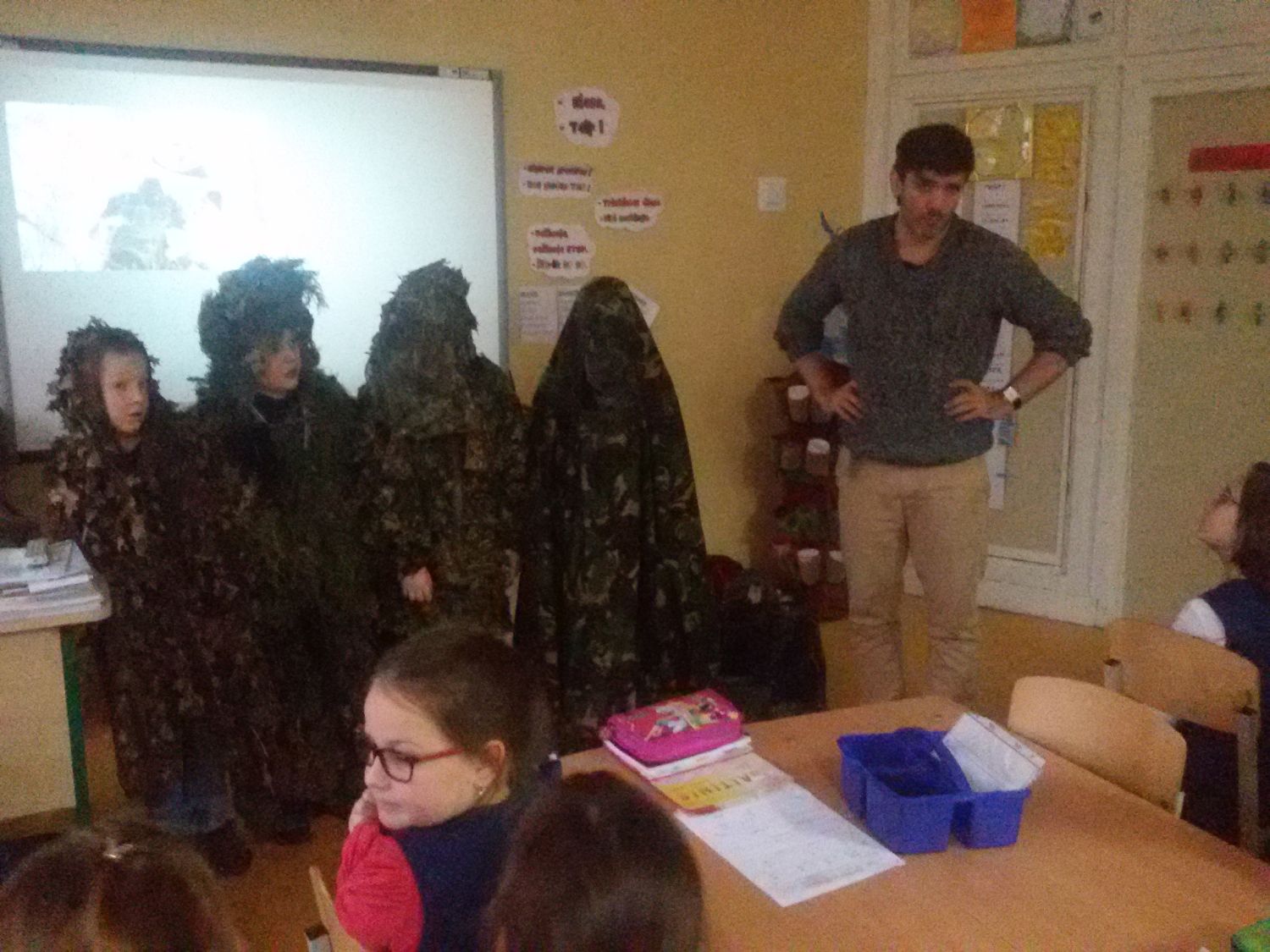 Keliems klasės berniukams pasisekė labiau už kitus. Jie galėjo pasimatuoti specialius fotografo drabužius, padedančius susilieti su gamta ir likti nepastebėtam, pakilnoti sunkų ir didelį fotoaparatą.